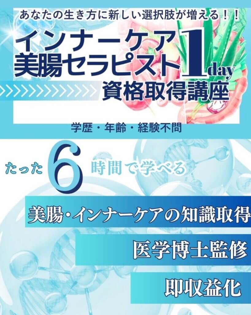 講座内容の大幅リニューアルに伴い、 【美腸セラピスト1day資格取得講座】に関する記載事項に一部変更を行いました。 講座名も【インナーケア美腸セラピスト1day資格取得講座】と改訂しております。 詳しくは講座にてお伝えさ…